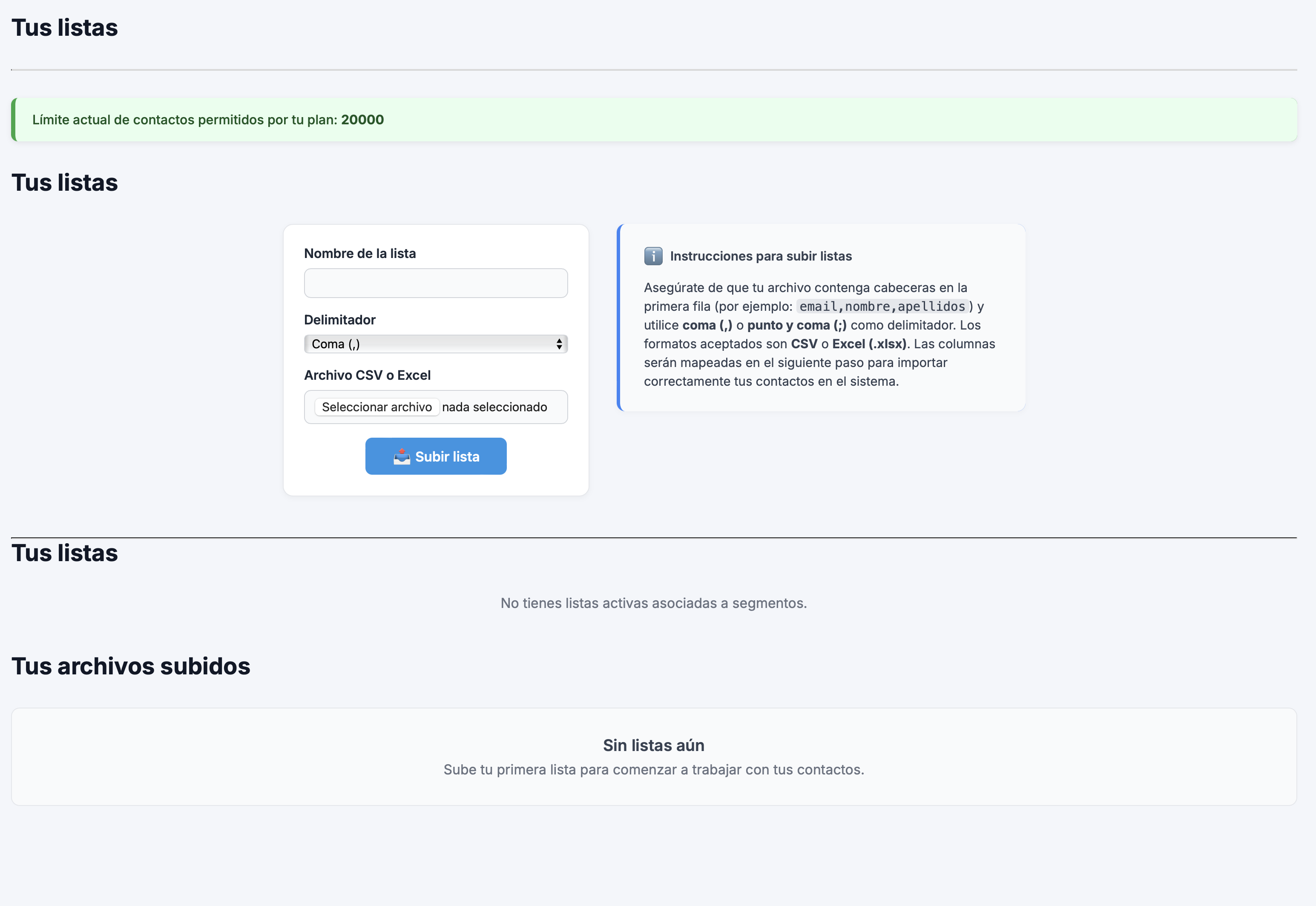 En la parte superior verás el límite de contactos de tu plan. Debajo, el formulario para añadir tu nueva lista.