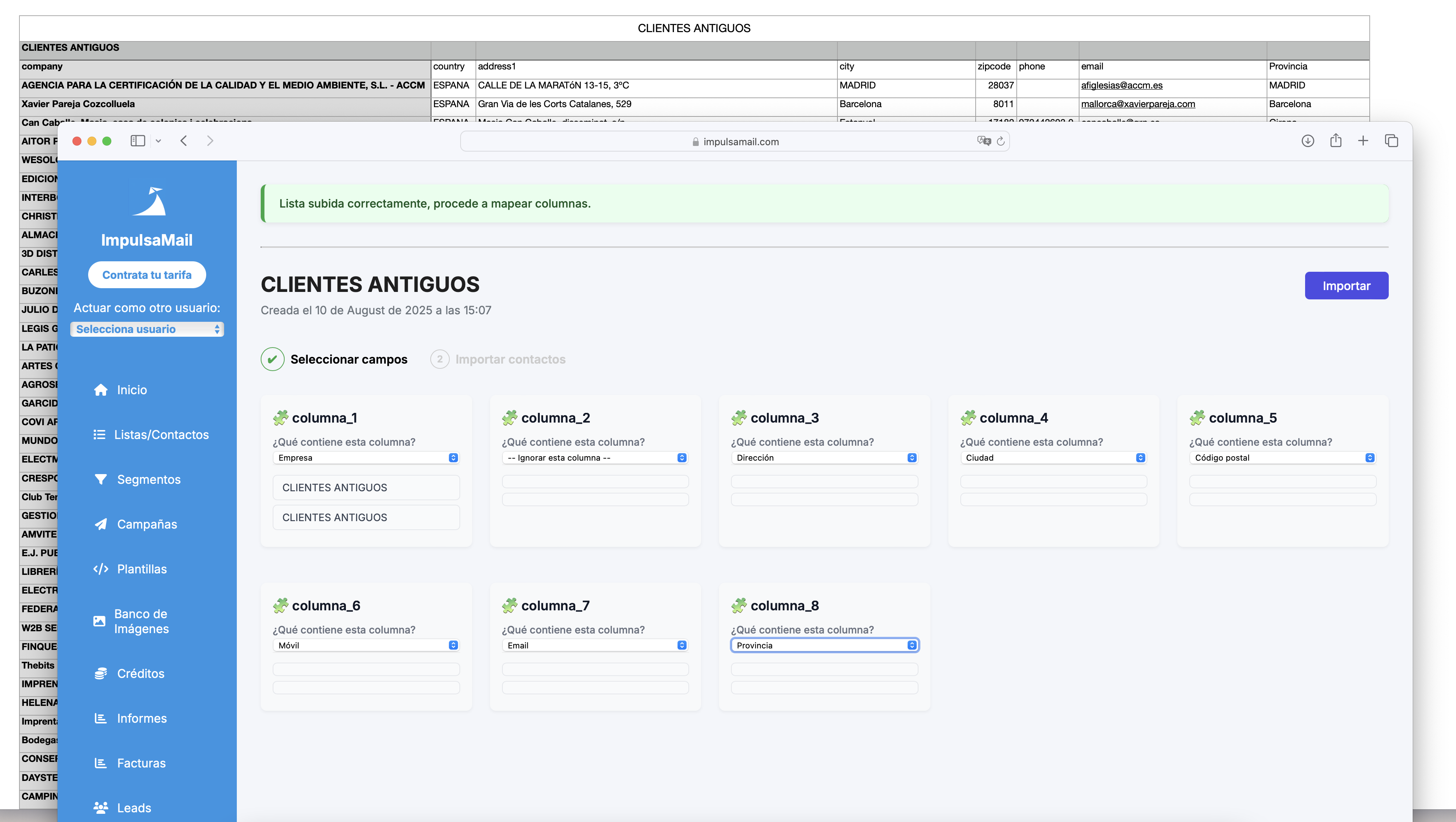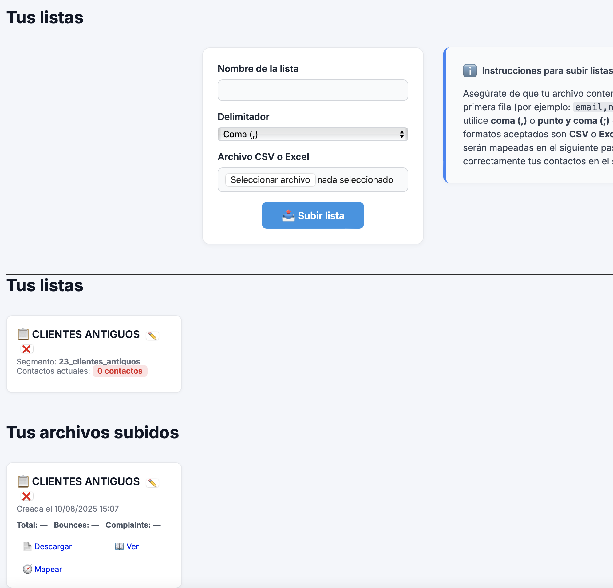 Una vez finalizada la importación, tu lista aparecerá en la sección Tus listas y el archivo original quedará guardado en Tus archivos subidos.