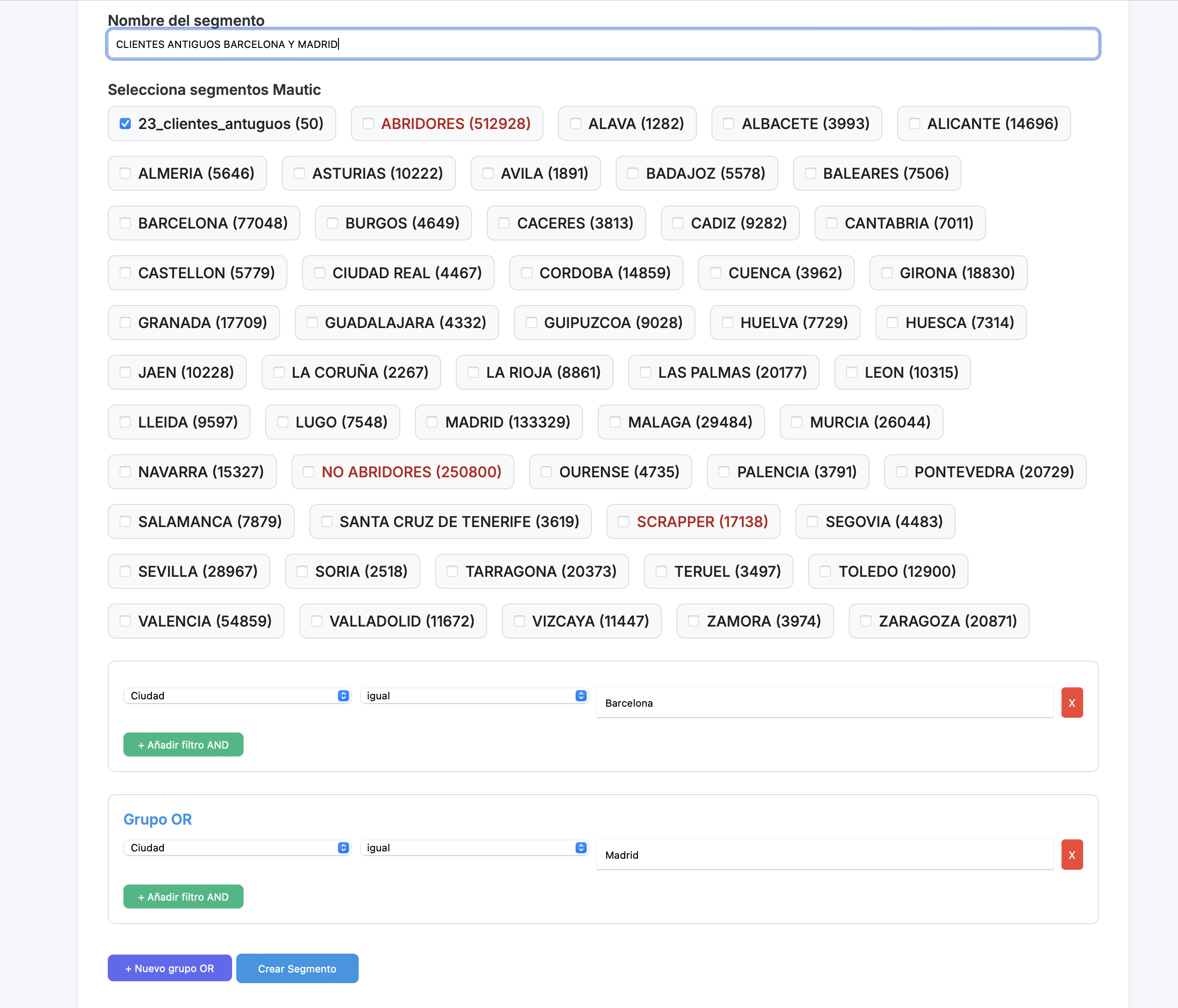 En este caso hemos creado un segmento llamado “CLIENTES ANTIGUOS BARCELONA Y MADRID”.