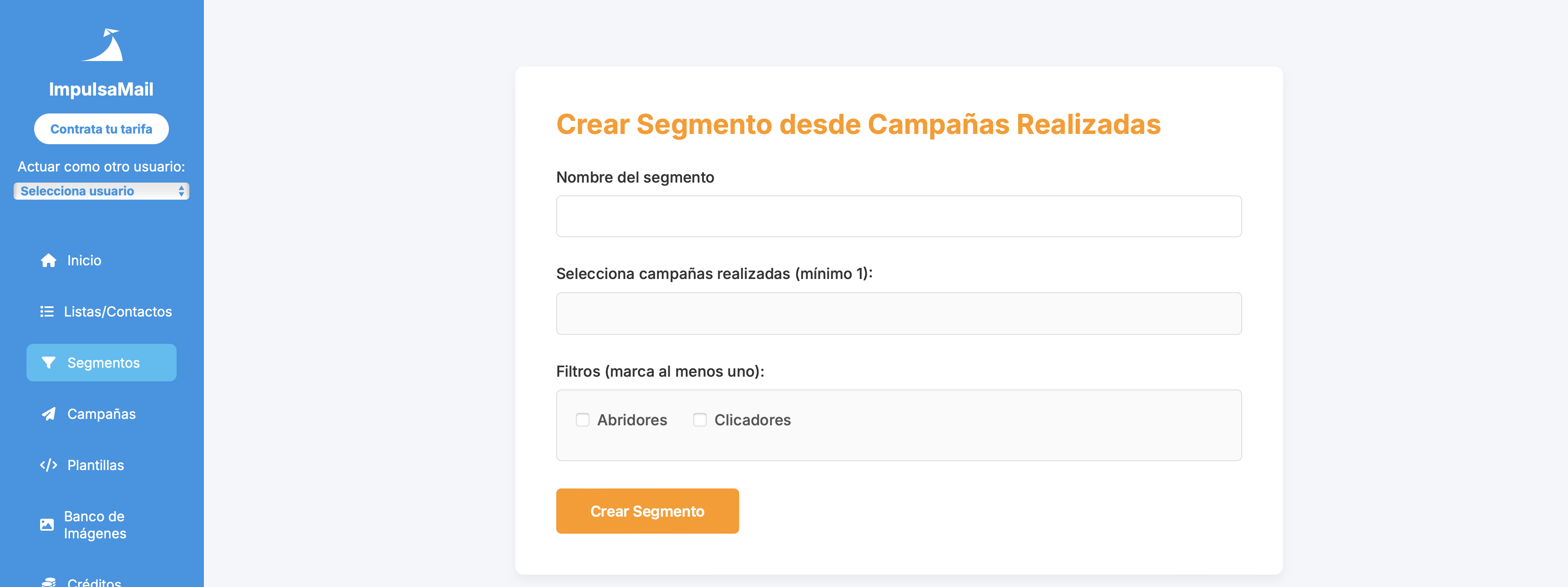 Con esta opción puedes generar un nuevo segmento basándote en campañas que ya enviaste. Es útil para seguir trabajando solo con los contactos que realmente interactuaron.